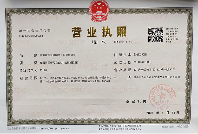 唐山鏵鋒金屬制品有限責(zé)任公司其前身系唐山金澤凱金屬制品有限責(zé)任公司,是一家專注自行車、電動(dòng)車零配件及民用散熱器管型材的生產(chǎn)型企業(yè)。地處112國(guó)道222公里處,地理位置優(yōu)越,交通便利。辦公、研發(fā)、檢測(cè)、生產(chǎn)、倉(cāng)儲(chǔ)設(shè)施配套齊全,車筐、車架鋁配件及鋁型材六大類千余個(gè)品種。